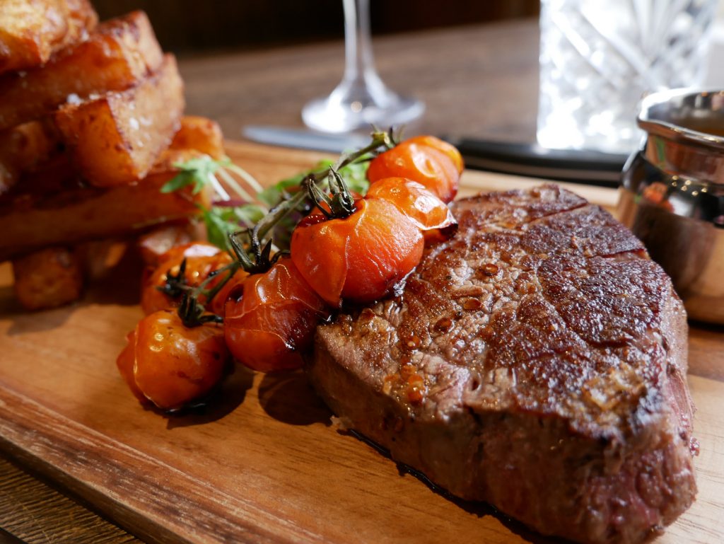 Hand-cut chips, cherry vine tomatoes, peppercorn sauce